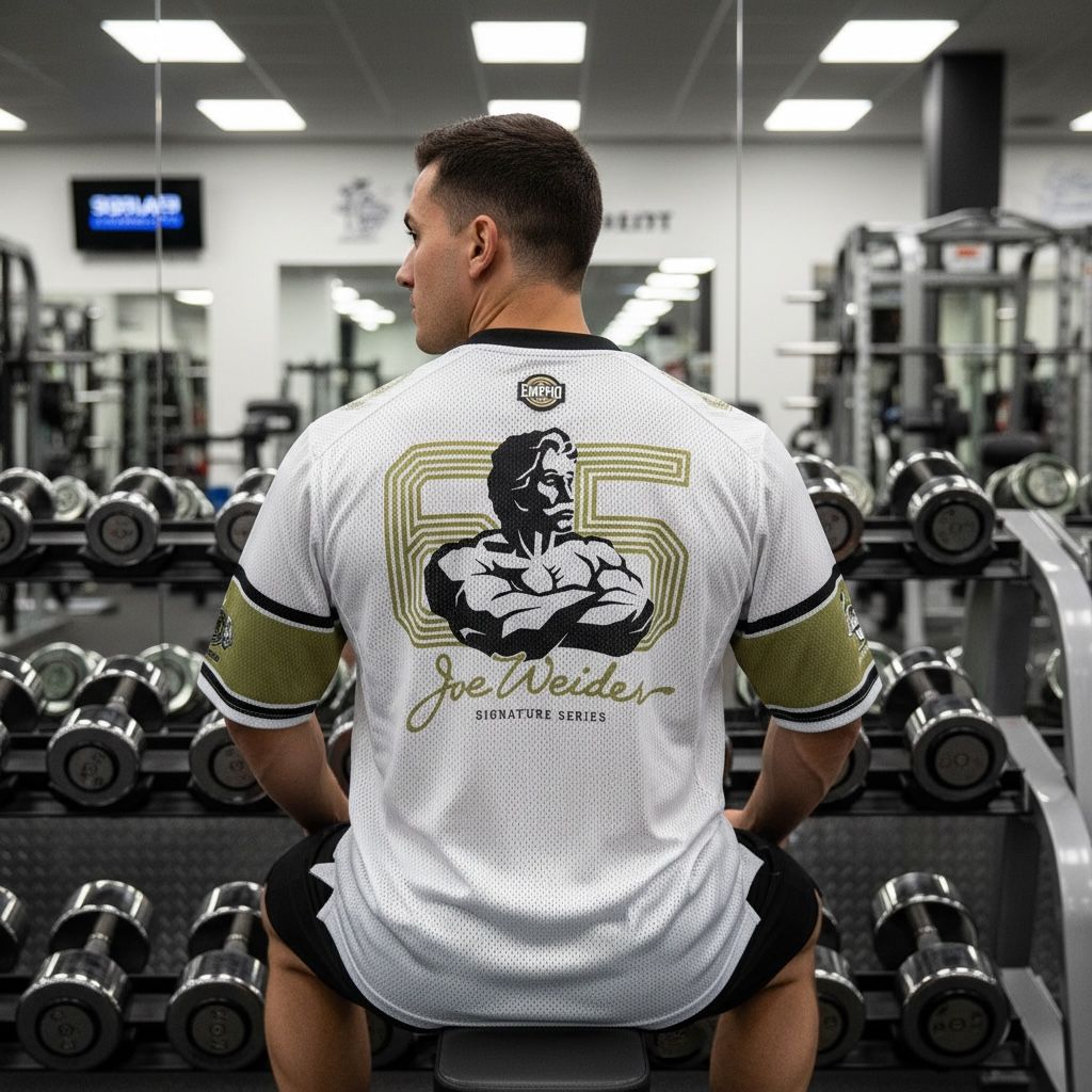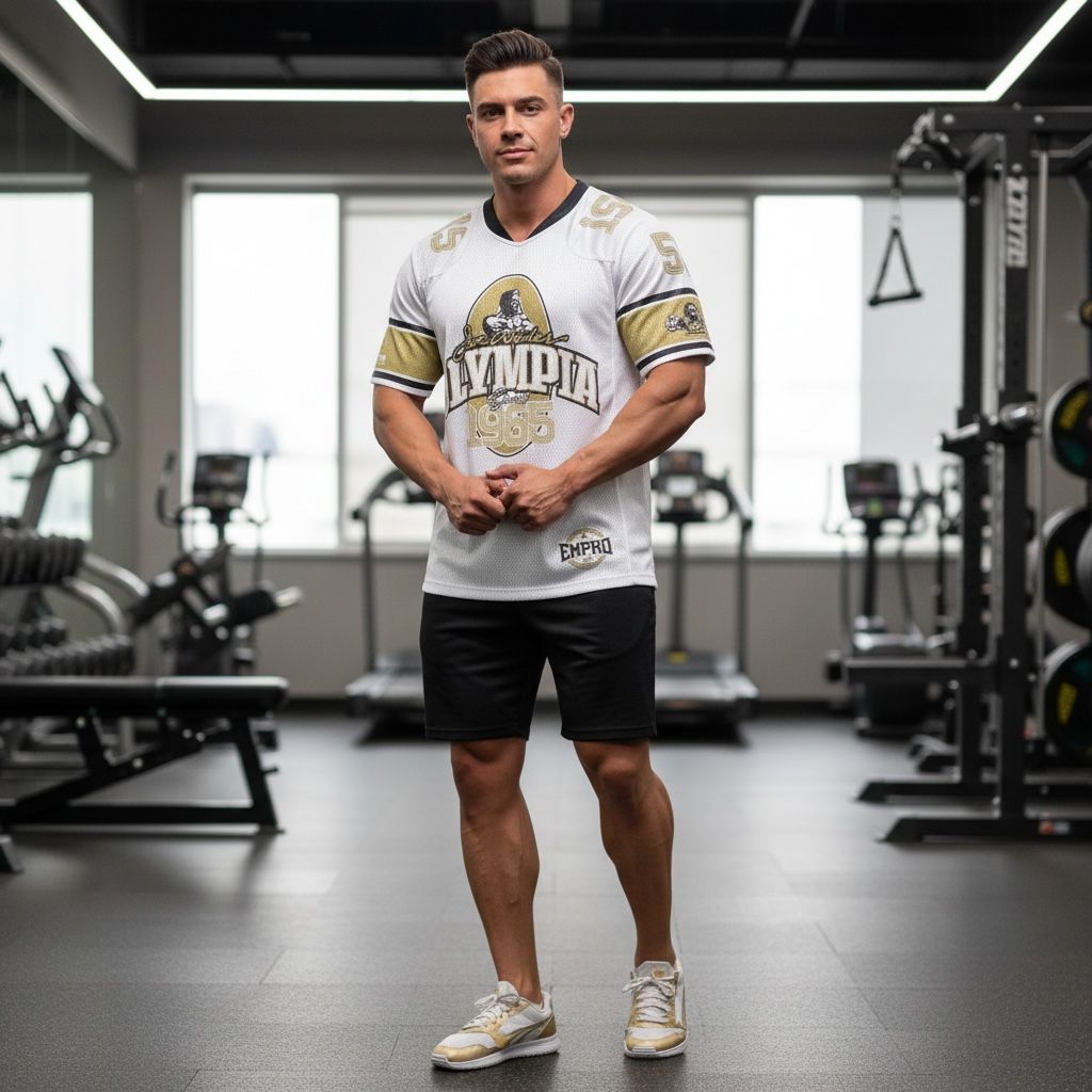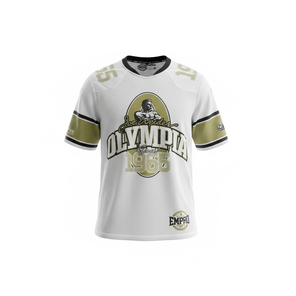 Rinde homenaje al nacimiento del Mr. Olympia con esta exclusiva camiseta estilo NFL inspirada en 1965, el año que marcó un antes y un después en la historia del culturismo.