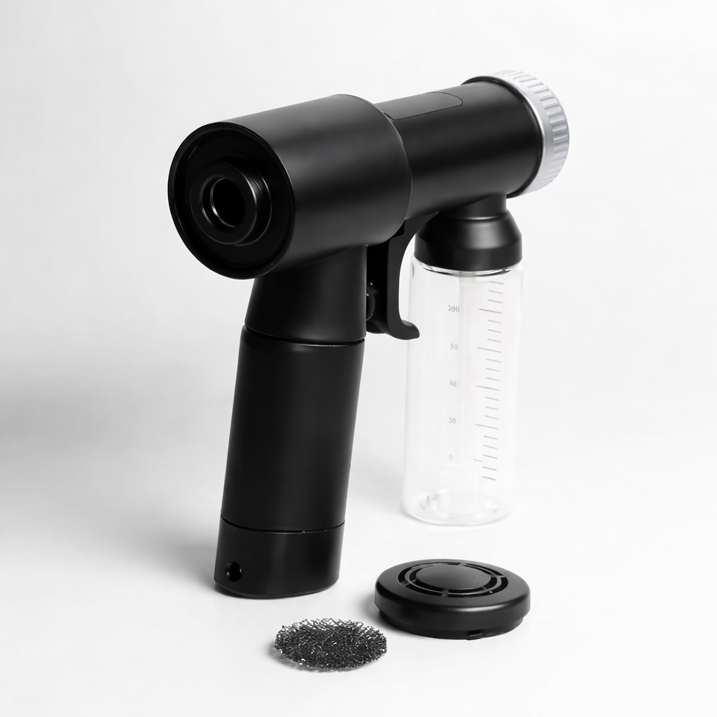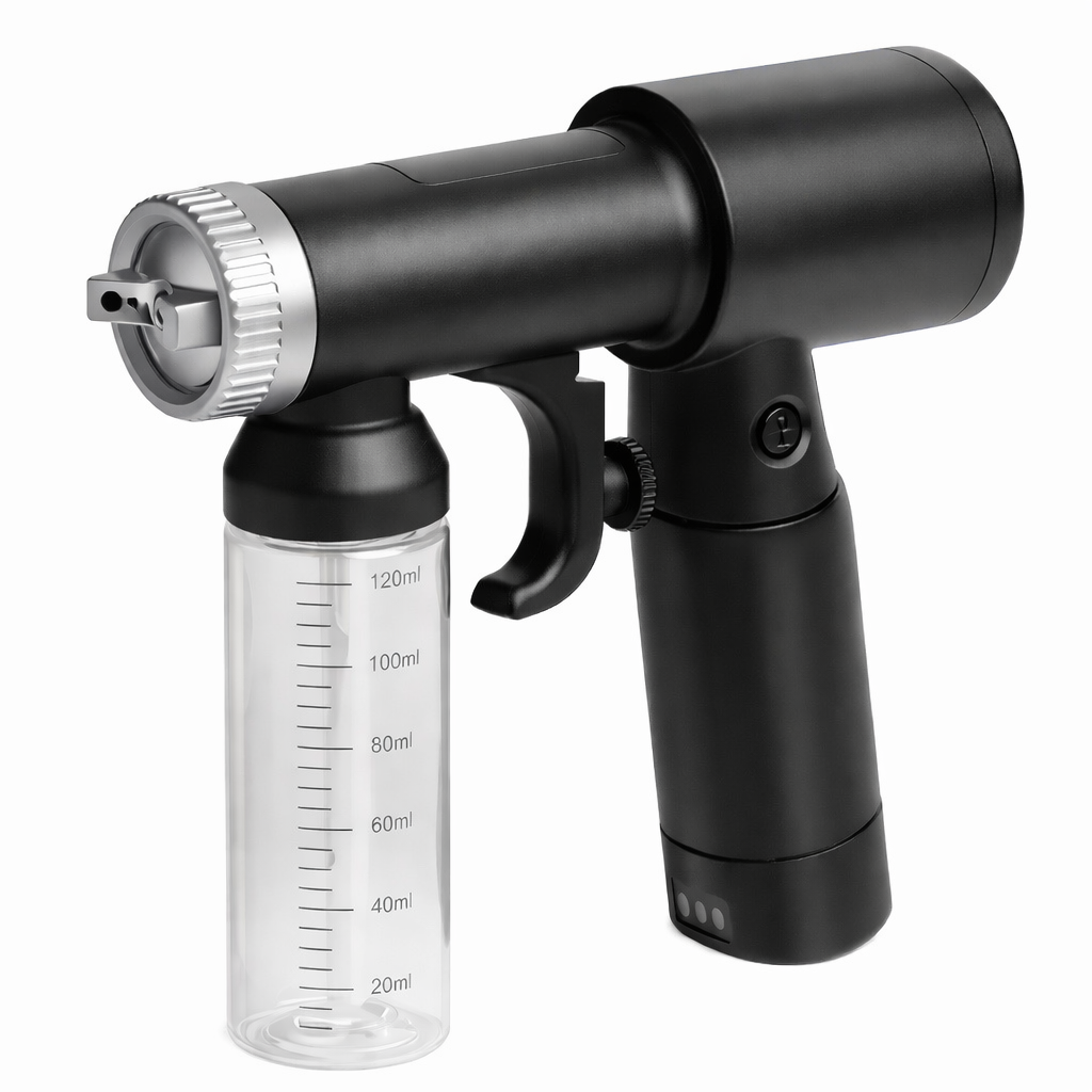 Gracias a su sistema de alimentación directa, esta máquina garantiza potencia estable y continua, asegurando una pulverización homogénea durante toda la sesión.